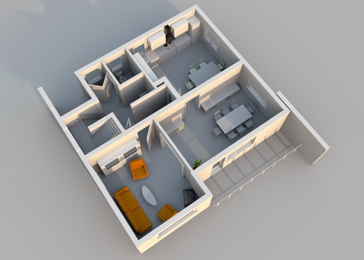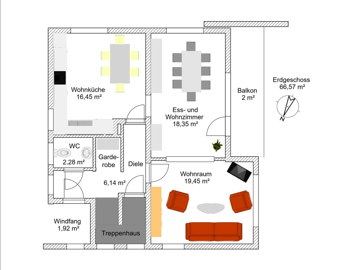 Durch den überdachten Eingangsbereich gelangt man ins Erdgeschoss. Hier befinden sich ein Gäste WC, eine sehr große und geräumige Küche, ein Esszimmer mit Durchgang in das Wohnzimmer.