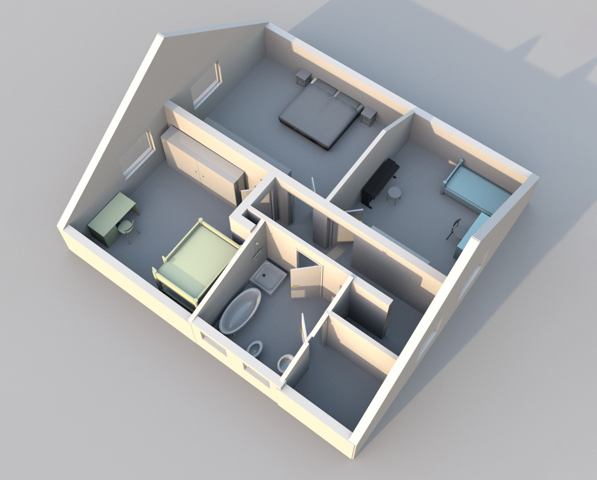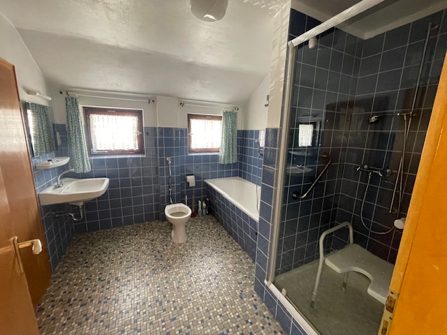 Über ein geschmackvoll gestaltetes Treppenhaus mit schönen Rundfenstern gelangt man ins Obergeschoss. Dieses ist mit einem großen Badezimmer mit Dusche und Badewanne und kleiner Abstellkammer und drei weiteren Zimmern ausgestattet. Die drei Zimmer bieten verschiedenste Nutzungsmöglichkeiten ( Schlafzimmer, Kinderzimmer, Büro etc.).