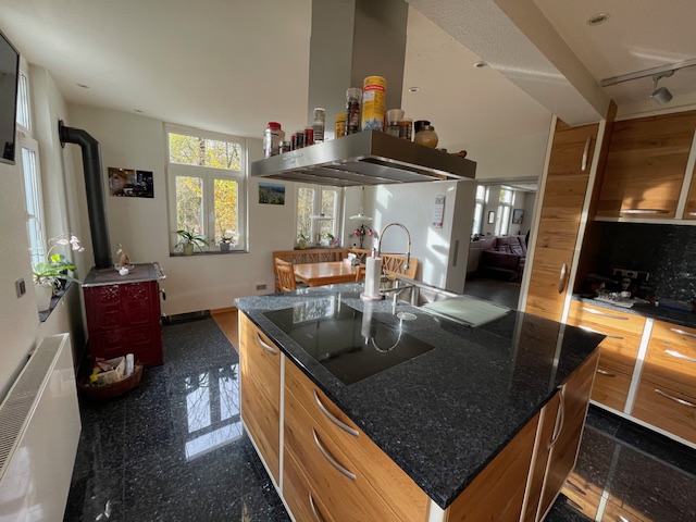 Neben dem Wohnzimmer befindet sich die vom Schreiner angefertigte Wohnküche mit Granitboden und Arbeitsplatte.