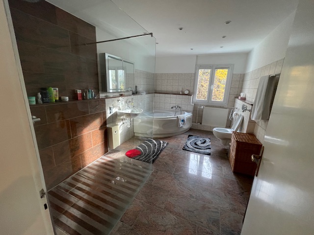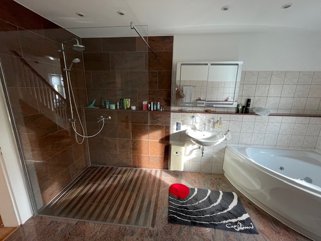 Das zweite Badezimmer besticht durch seine riesengroße, bodentiefe Dusche, sowie der Eckbadewanne mit Wirlpool.