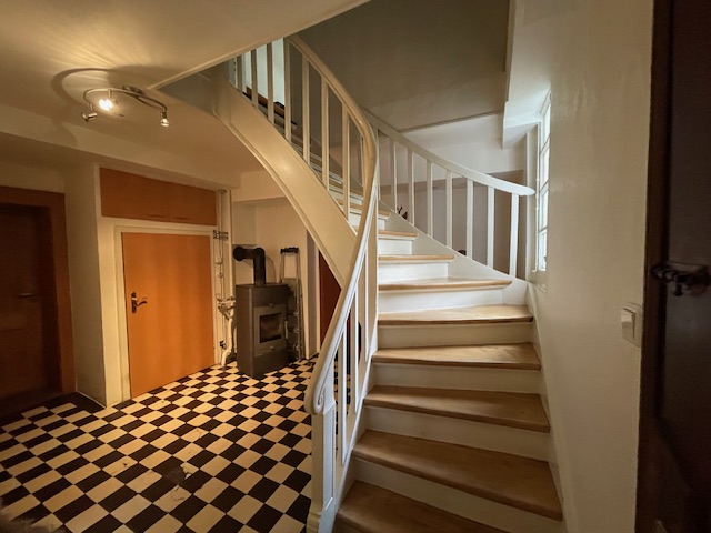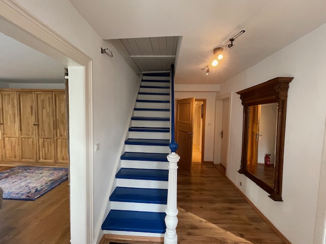 Über den stilvoll renovierten Flur gelangt man über eine Treppe ins Obergeschoss. Auch hier finden sich die massiven Holzdielenböden wieder.