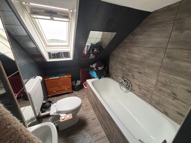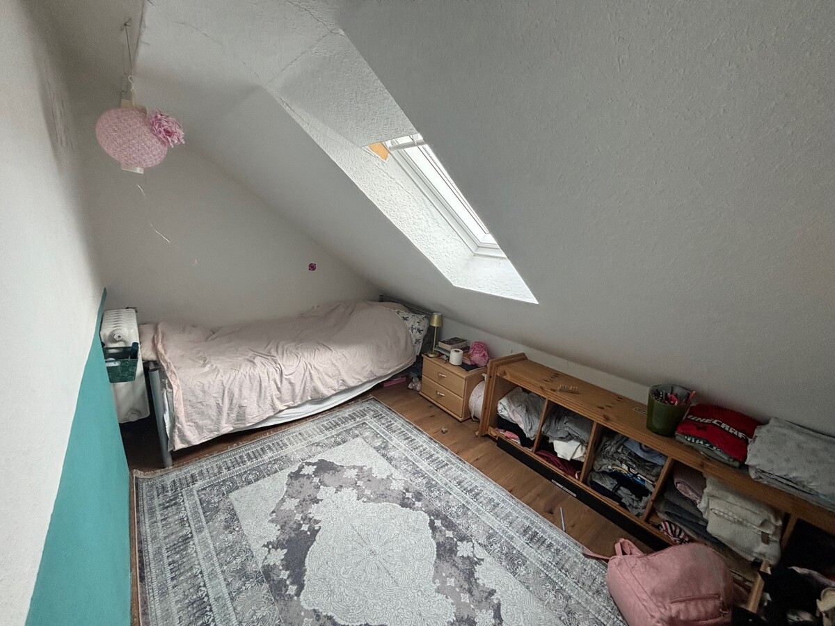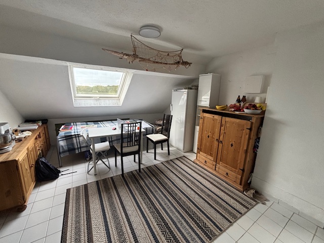 Die Wohnung im Dachgeschoss ( 64 m²) bietet durch die Balken und Schrägen eine gemütliche Atmosphäre. Diese Einheit ist mit drei Zimmern, einer sehr großen Wohnküche und einem Badezimmer ausgestattet.