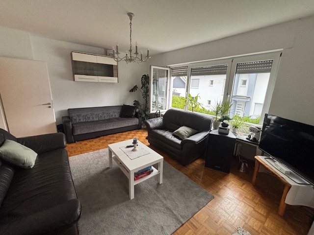 Die Wohnung im Erdgeschoss ( 85m²) ist mit einem großen, hellen Wohnzimmer mit Zugang zur Terrasse, zwei weiteren Zimmern, sowie einer große Küche und einem Badezimmer ausgestattet.