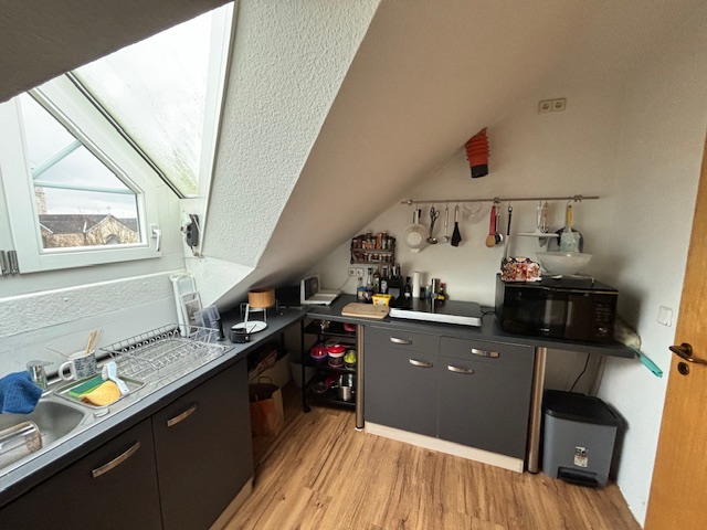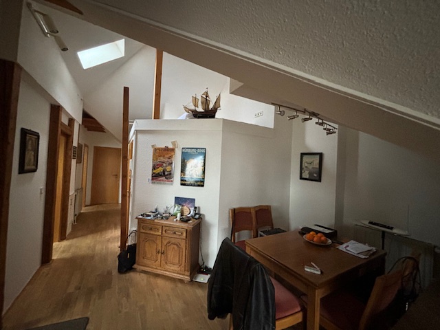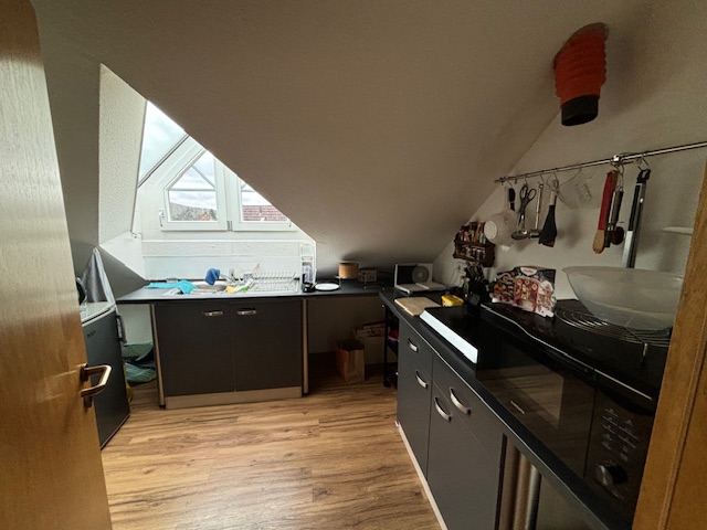Die Küche grenzt an diesen Bereich an und bietet durch die Gaubenfenster eine besondere Atmosphäre.